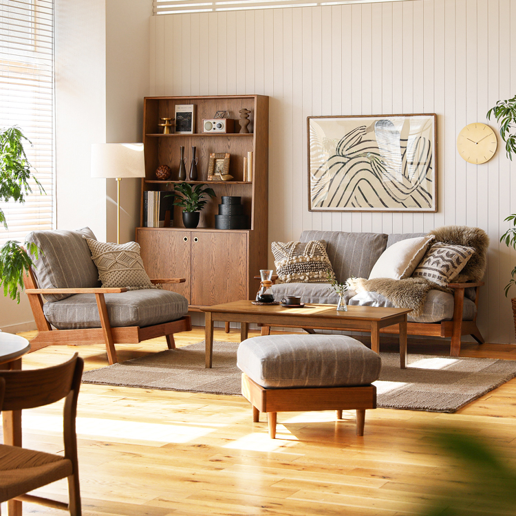- ソファ: 本物の天然木を使用したシンプルで直線的なソファや、低めの背もたれで圧迫感を与えないソファセット(落ち着いたグレーカラーなど)が、アースカラーの優しい色合いで空間に調和します。